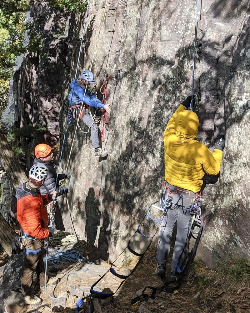 Clinic students practice aid climbing techniques at Birthday Wall.
